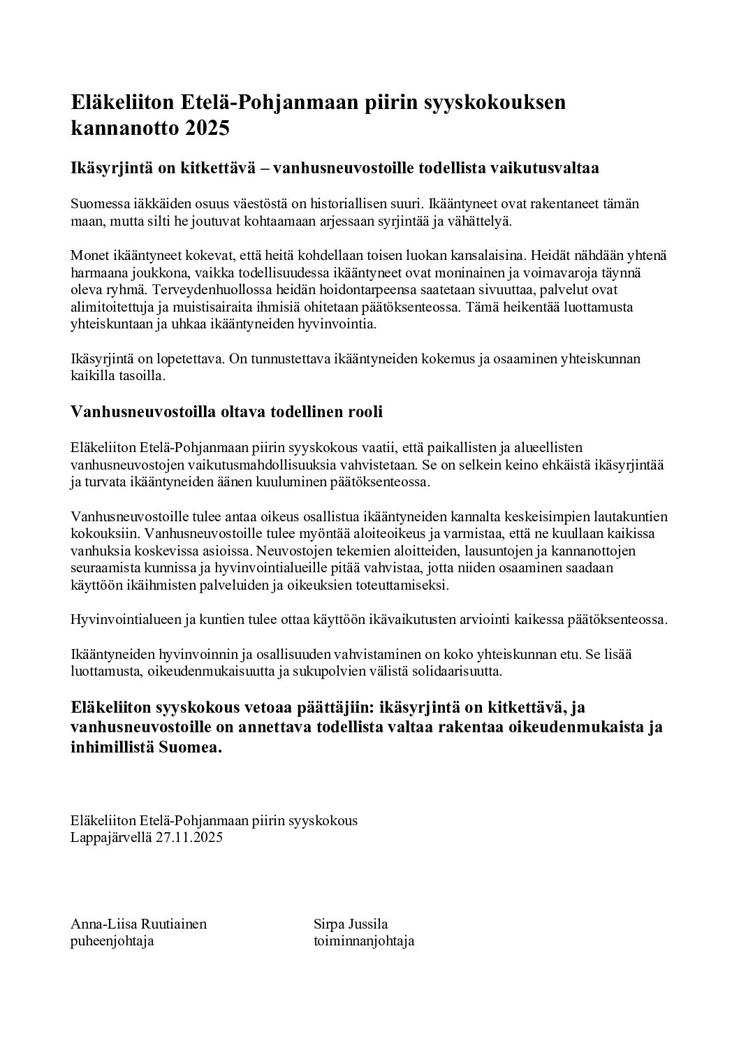EL Etelä-Pohjanmaan piirin syyskokous hyväksyi 2025 piirihallituksen esittämän kannanoton.